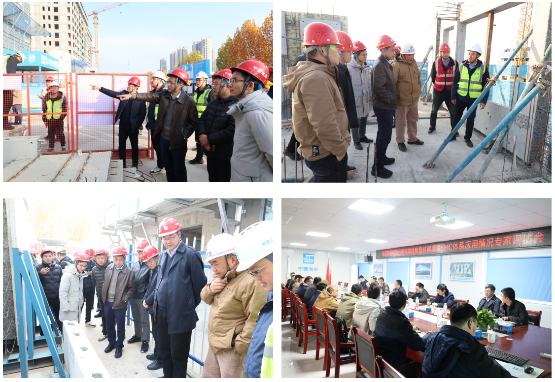 评估组一行先听取了项目基本情况和EMC实施进展,随后深入现场,详细查看了EMC体系试点应用楼栋的构件堆场、样板房以及墙板等各个部位施工细节,并召开现场总结评估会。